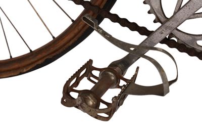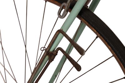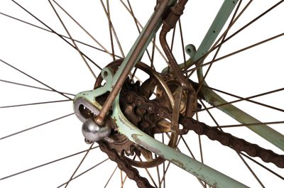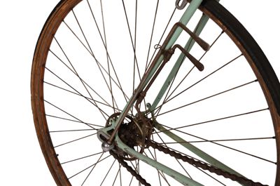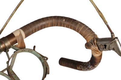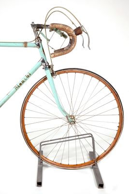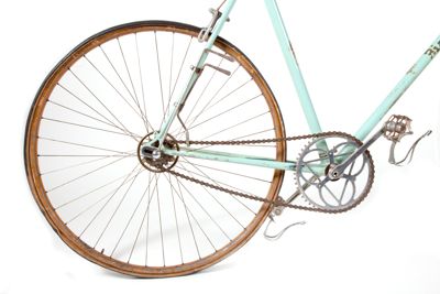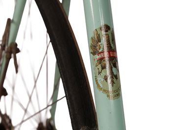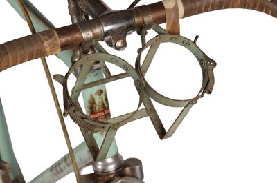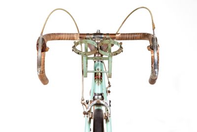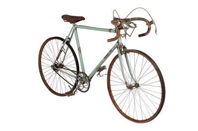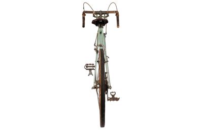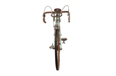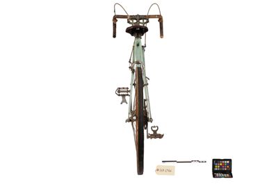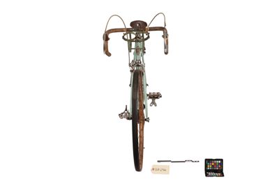 Bicicletta da corsa con telaio tubolare a trapezio e forcella in acciaio, verniciato di colore celeste. Il manubrio a corna presenta le impugnature rivestite da un nastro di tela cerata e le estremità chiuse da un tappo di sughero; le leve dei freni a ganasce, azionati a filo, sono situate nella parte superiore delle impugnature. Davanti al manubrio è appeso un portaborracce in metallo, dotato di due spazi. La bicicletta monta una sella in cuoio rigido. Il funzionamento si basa su una trasmissione a catena sulla ruota posteriore, tesa tra una corona da 49 denti e quattro diversi pignoni rispettivamente da 18, 18, 16 e 15 denti, con cambio comandato a bacchetta per mezzo di due leve situate sul fianco destro del veicolo; i pedali sono a gabbietta in metallo. La bicicletta poggia su ruote con cerchi in legno da 28", raggi tangenti in metallo e gomme piene; la ruota anteriore conta 36 raggi, mentre la ruota posteriore presenta 40 raggi.