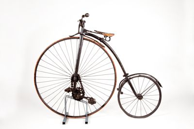 Biciclo con telaio tubolare in metallo e forcella in lamiera, verniciati nero. La ruota posteriore è coperta da un parafango in lamiera, anch'esso verniciato di nero, mentre un piccolo parafango anteriore, costituito da un foglio di cuoio intelaiato su un supporto metallico, è posto al di sotto della sella. Due pedivelle situate nella parte posteriore del telaio consentono di montare sulla sella, fissata sul telaio frontalmente alla ruota anteriore; la sella, provvista di molle, è costituta da una lamina in legno, rivestita di pelle. Il manubrio presenta manopole in legno e, sulla destra, la leva per il comando del freno a pattino sulla ruota anteriore, il funzionamento si basa su due pedali regolabili che, per mezzo di una moltiplica, muovono la ruota anteriore. Il veicolo poggia su due ruote con cerchio e raggi in metallo, provviste di battistrada in gomma piena; la ruota anteriore conta 40 raggi, mentre la ruota posteriore dispone di 20 raggi.