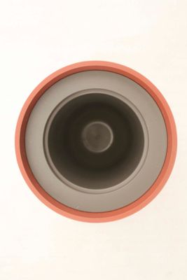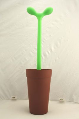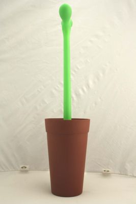 Vasetto di colore marrone chiaro che nasconde al suo interno lo spazzolone per il wc in gomma verde acido, da cui spunta un lungo arbusto color verde chiaro dal lungo stelo caratterizzato, in cima, dalla presenza di due foglioline simmetriche e carnose che fungono da impugnatura. La finitura della plastica del vasetto, per sottolineare l'analogia con quelli in cotto delle piante, e' opaca; quella dell'arbusto e' satinata e piu' brillante.