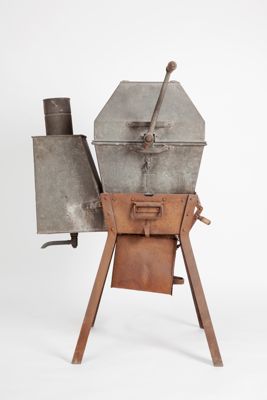Macchina lavabiancheria manuale con fornello. Iscrizioni sul coperchio, frontalmente: