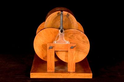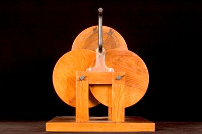 Il modello ricostruisce uno studio di rulli per esperienze sull'attrito. Un rullo ruota su un asse di ferro che a sua volta poggia su dischi di legno.