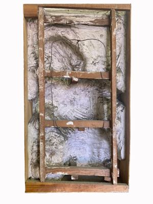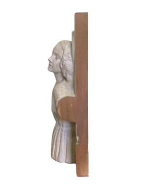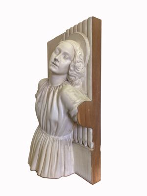Calco in gesso raffigurante Santa Cecilia, a mezza figura, opera dello scultore Arrigo Miberbi. Sullo sfondo, canne d'organo.