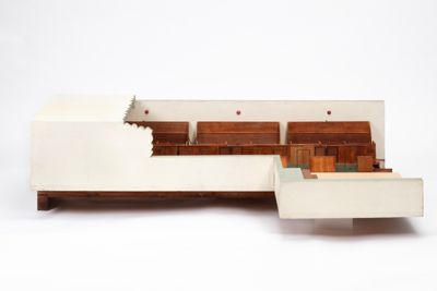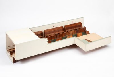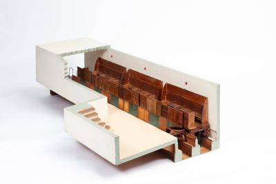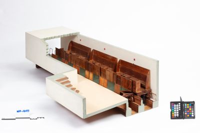 Il modello ligneo policromo è una sezione in scala di un tunnel sotterraneo nel quale scorrono dei vagoni per il trasporto di persone parallelamente ad un nastro semovente attiguo per consentire la salita e la discesa dei passeggeri.