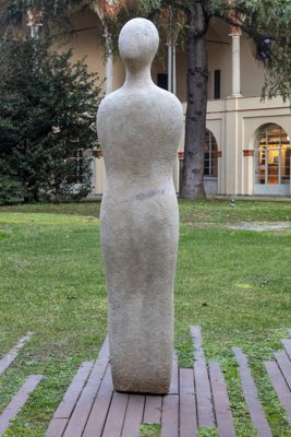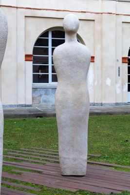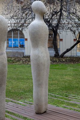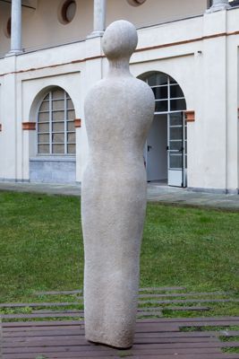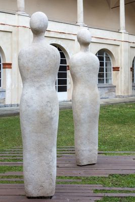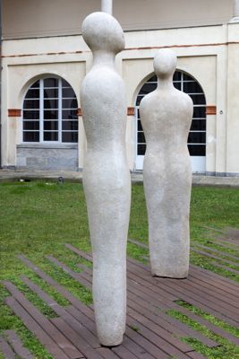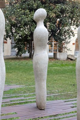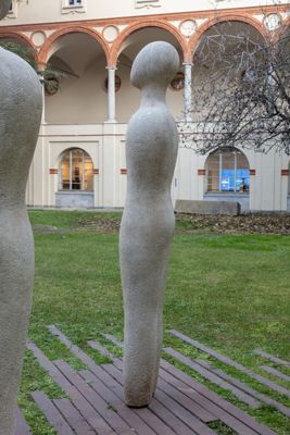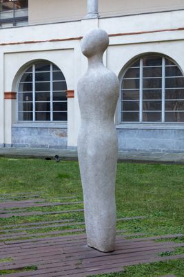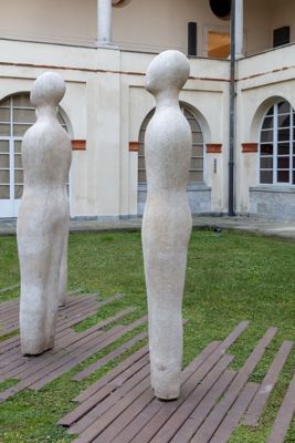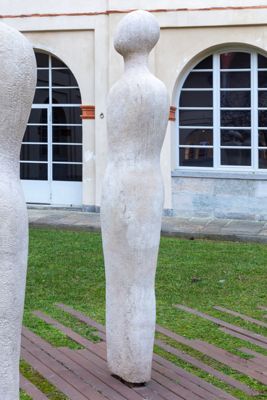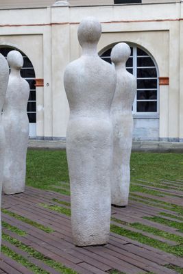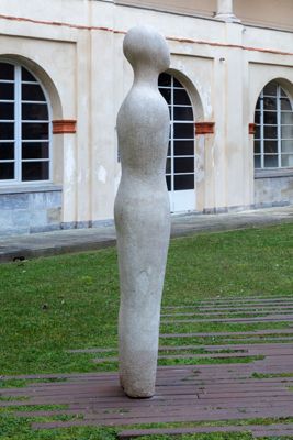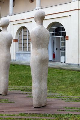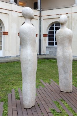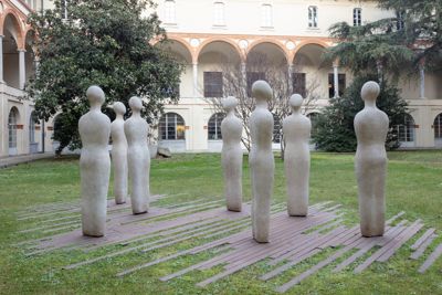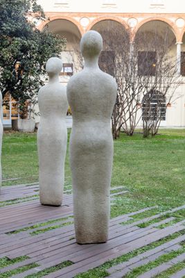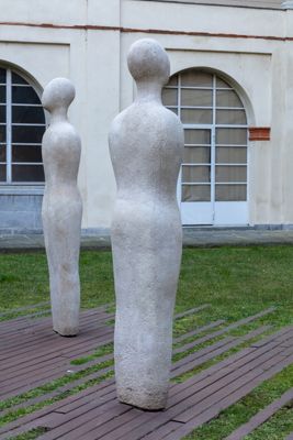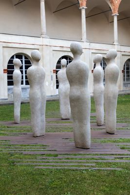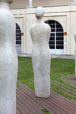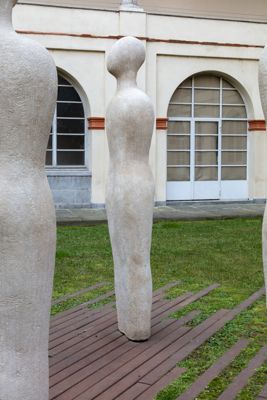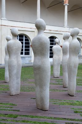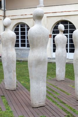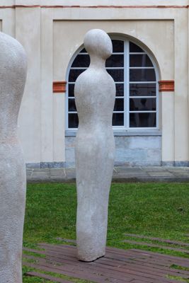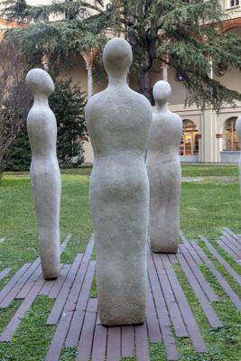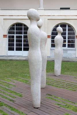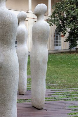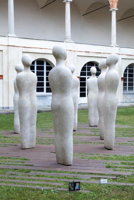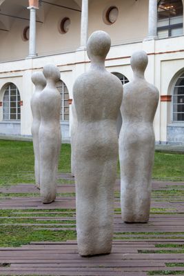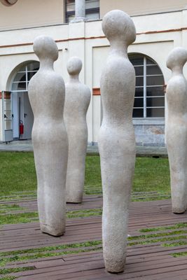 Gruppo scultoreo in pietra di Viggiù, composto da 7 elementi raffiguranti figure antropomorfe stilizzate.