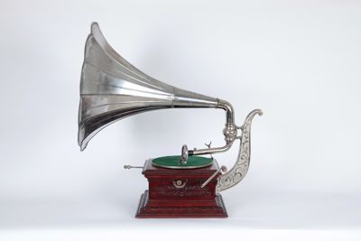 Grammofono a cassetta per la riproduzione di dischi da 50 cm di diametro, con grande tromba a giglio in metallo nichelato.