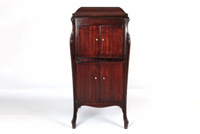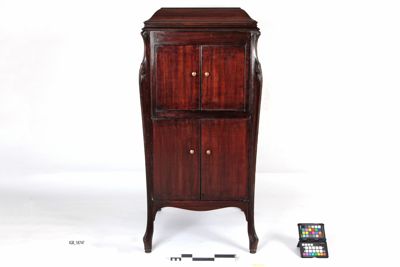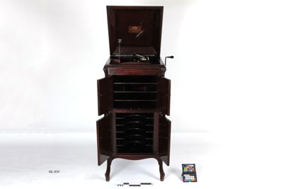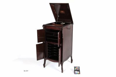 La parte frontale è divisa in due sezioni: una inferiore adibita alla custodia dei dischi, e una superiore con due sportelli in legno che nascondono la tromba interna.