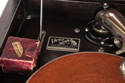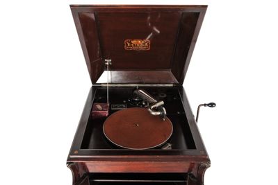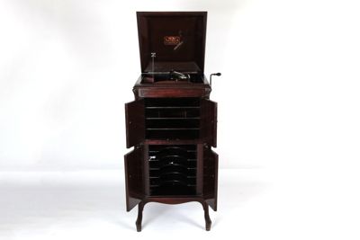 Sul pannello superiore sono montati il giradischi, il braccio che collega la puntina di riproduzione alla tromba interna, e delle leve per la regolazione della velocità del disco. Sul lato destro del mobile è presente la manovella per il caricamento del motore a molla.