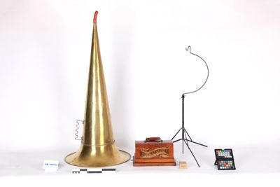 La tromba in ottone, di forma conica, ha una lunghezza considerevole ed è accessoriata con supporto in metallo.