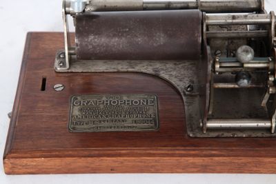 Fonografo Columbia modello BS per la riproduzione di cilindri di cera, costituito da una sottile base in legno e un coperchio dotato di maniglia per il trasporto. Sulla parte frontale del coperchio è rappresentato un nastro dorato, con all'interno la scritta "The Graphophone" e i brevetti. Ai lati della cassetta sono presenti le serrature per la chiusura del coperchio.