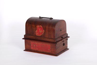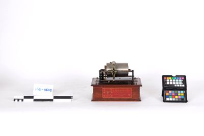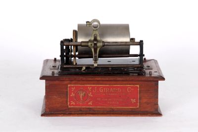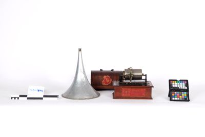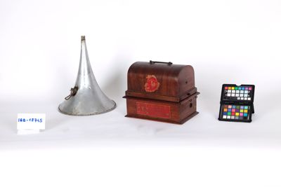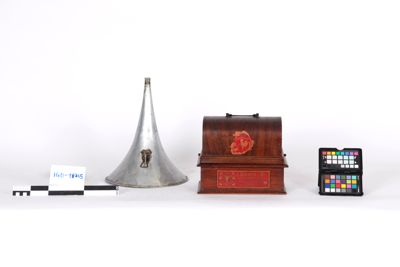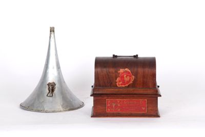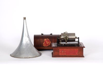 Fonografo a cassetta in legno per la riproduzione di cilindri di grandi dimensioni, dotato di coperchio.