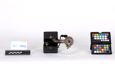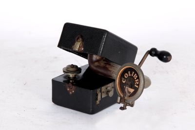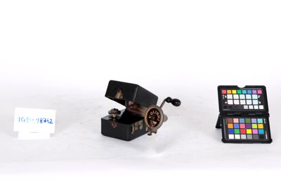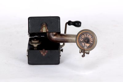 La leva di avviamento e la vita per la regolazione della velocità si trovano sul pannello laterale. Sullo stesso pannello si trova anche l'alloggiamento per la manovella che carica il motore a molla.