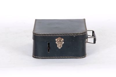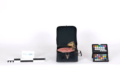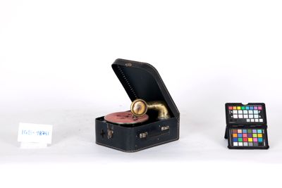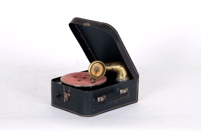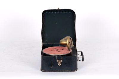 Piccolo grammofono a valigetta di cartone di colore verde scuro per la riproduzione di dischi.