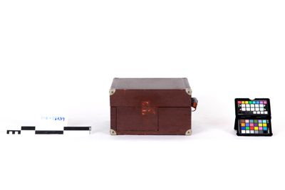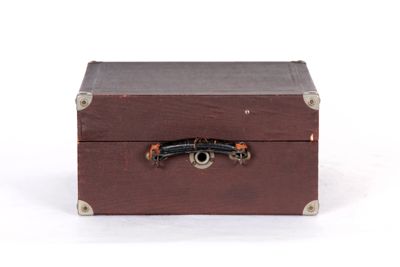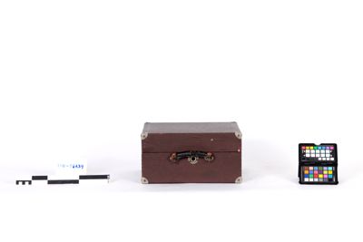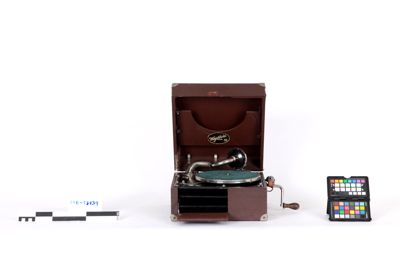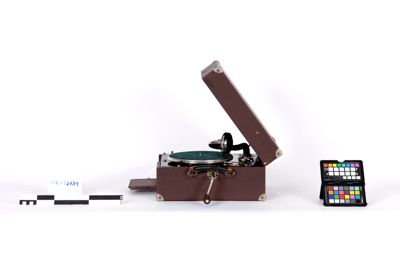 Grammofono montato all'interno di una custodia in legno a forma di valigia, rivestita di similpelle grigia, rinforzata con piastre metalliche agli angoli. Il coperchio della custodia è fissato in posizione aperta da una barra di sostegno. La maniglia per il trasporto è fissata sul lato destro della valigia. Sul lato interno del coperchio si trova il marchio di fabbrica "Majestrola" in caratteri dorati.