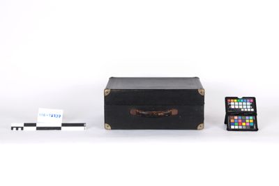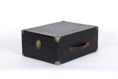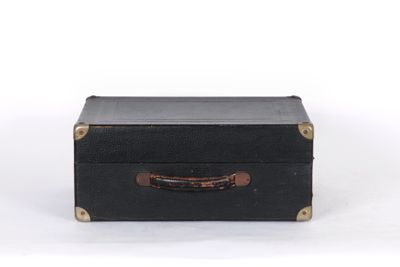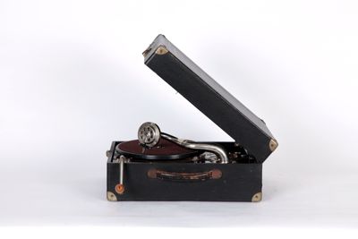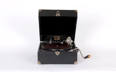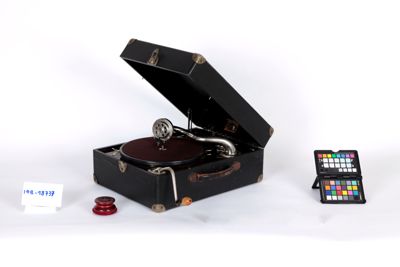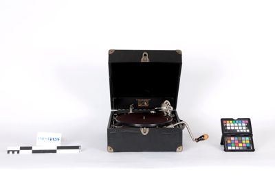 Grammofono montato all'interno di una custodia di legno rivestita di similpelle nera, a forma di valigia, rinforzata con piastre metalliche agli angoli. Il coperchio della custodia è fissato in posizione aperta da una barra di sostegno. La maniglia per il trasporto è fissata sul lato destro della valigia.