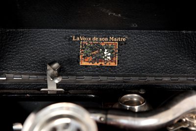 Il contenitore per gli aghi del grammofono si trova nell'angolo anteriore destro della custodia. Sul lato interno del coperchio si trova un pannello quadrato con l'immagine del marchio di fabbrica, un cane seduto davanti a un grammofono.
