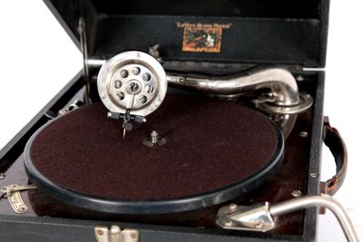 La tromba del grammofono nascosta si trova sotto il pannello superiore. Il suono esce dalla finestra ornata nella parte posteriore del pannello.
