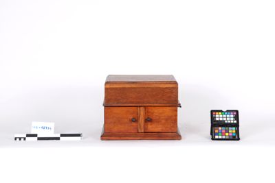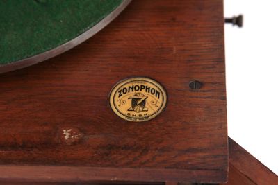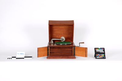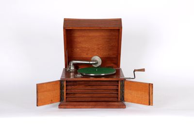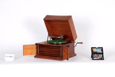 Sul pannello superiore si trova il giradischi rivestito di feltro verde. Una manovella per l'avvolgimento del motore a molla si trova sul pannello laterale destro.
