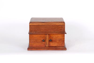 Grammofono a cassetta in legno con tromba interna e due sportelli sul pannello anteriore.