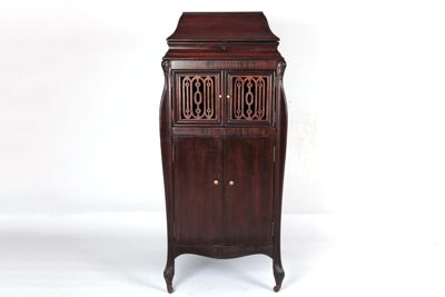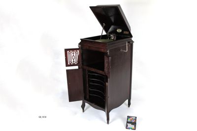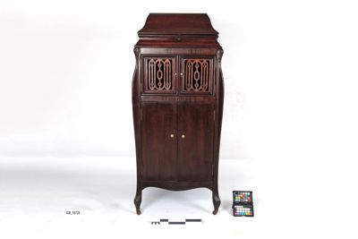 La parte frontale è divisa in due sezioni: una inferiore adibita alla custodia dei dischi, e una superiore con due sportelli in legno che nascondono la tromba interna.