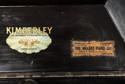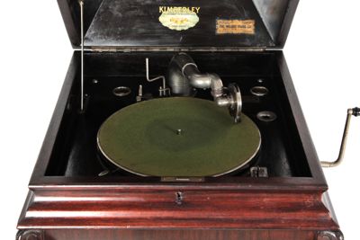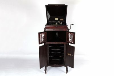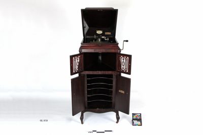 Sul pannello superiore sono montati il giradischi, il braccio che collega la puntina di riproduzione alla tromba interna, e delle leve per la regolazione della velocità del disco. Sul lato destro del mobile è presente la manovella per la carica del motore a molla.