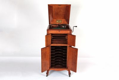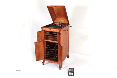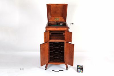 Sul pannello superiore sono montati il giradischi, il braccio che collega la puntina di riproduzione alla tromba interna, e delle leve per la regolazione della velocità del disco. Sul lato destro del mobile è presente la manovella per la carica del motore a molla.