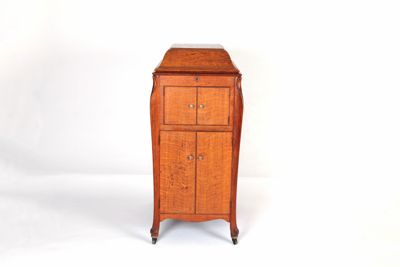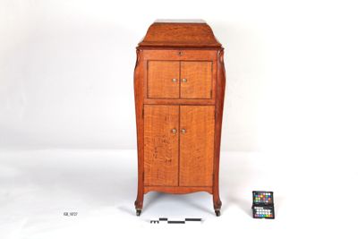 La parte frontale è divisa in due sezioni: una inferiore adibita alla custodia dei dischi, e una superiore con due sportelli in legno che nascondono la tromba interna.