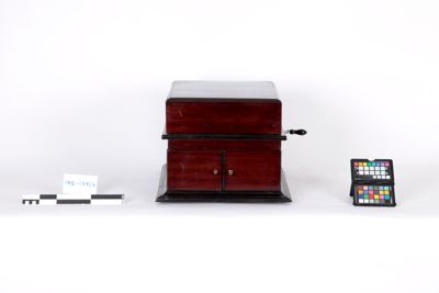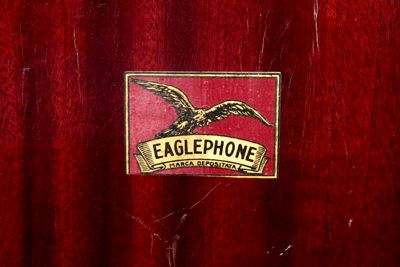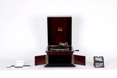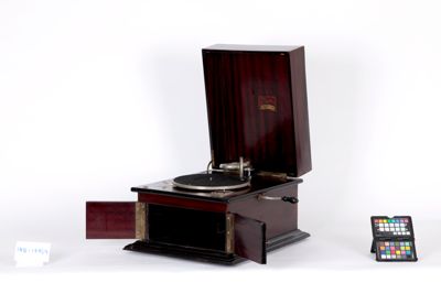 Sul pannello superiore si trova il giradischi rivestito di feltro nero. Una manovella per l'avvolgimento della molla si trova sul pannello laterale destro. La leva di avviamento e quella per la regolazione della velocità si trovano davanti al giradischi.