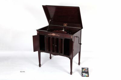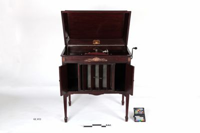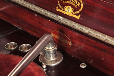 Sul pannello superiore sono montati il giradischi, ricoperto di feltro rosso, il braccio che collega la puntina di riproduzione alla tromba interna, e delle leve per l'avviamento e la regolazione della velocità del disco.