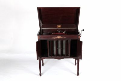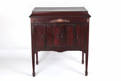 Grammofono a mobile orizzontale in legno di mogano rosso.