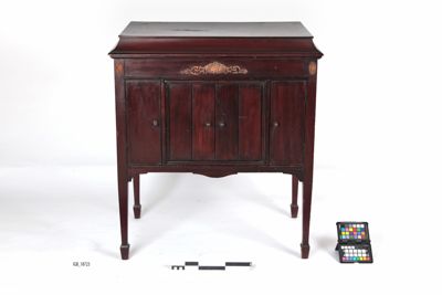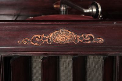Sulla parte frontale del mobile, decorata con intarsi, quattro sportellini nascondono la tromba interna, mentre due sportelli laterali chiudono le sezioni adibite alla custodia dei dischi.