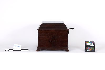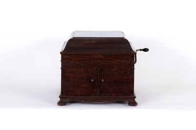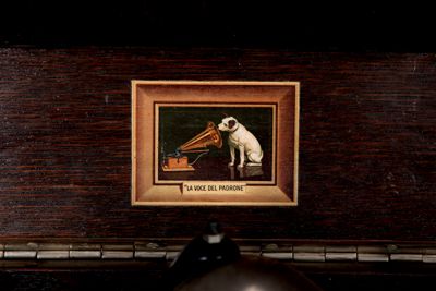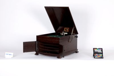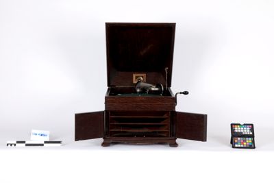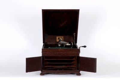 Sul pannello superiore si trova il giradischi rivestito di feltro verde. Una manovella per l'avvolgimento della molla si trova sul lato destro.