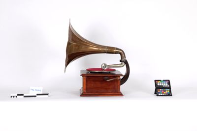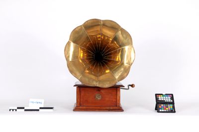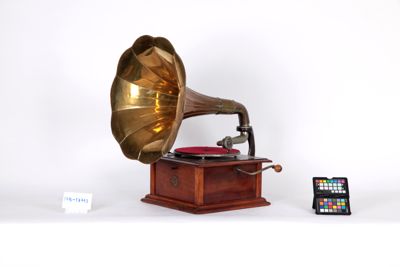 Sul pannello posteriore della cassa si trova la staffa in metallo che regge la cassa armonica e la tromba in ottone a forma di giglio. Sul pannello superiore si trovano il giradischi, ricoperto di feltro rosso, e le leve per l'avviamento del motore e la regolazione della velocità. Sul pannello frontale è presente il logo della ditta produttrice.