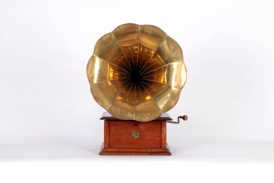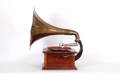 Grammofono a cassetta in legno per la riproduzione di dischi.