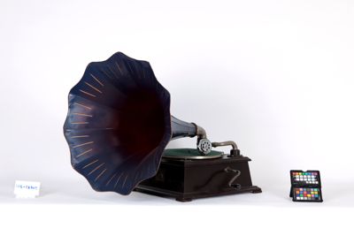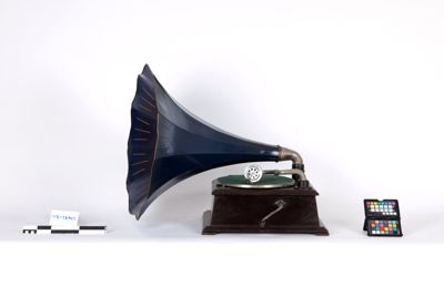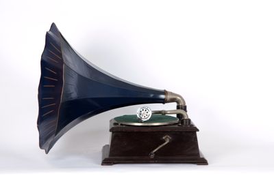 Sul pannello superiore è montato il giradischi, coperto da un panno verde. Vi è poi il supporto per la tromba a forma di giglio laccata bicolore in rosso ruggine e blu scuro, con intarsi dorati. Sempre sul pannello superiore si trovano il braccio che regge la puntina di riproduzione, e il regolatore della velocità di rotazione del disco, con una scala graduata sulla quale è visibile il numero 78 (giri al minuto).