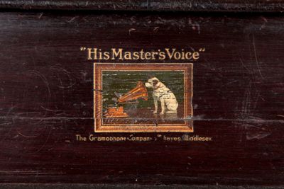 Sul lato destro della cassetta si trova un'apertura per l'alloggiamento della manovella di carica del meccanismo a molla. Sul lato anteriore si trova il marchio di fabbrica, un cane seduto davanti a un grammofono, poco leggibile.