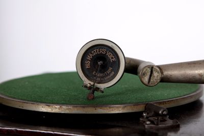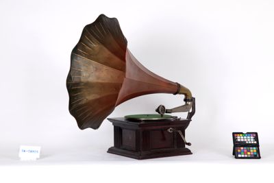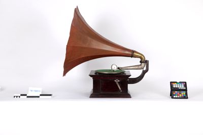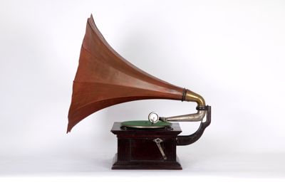Il meccanismo per la riproduzione dei dischi, ricoperto da un panno verde, è montato sul pannello superiore della cassa. La leva di avviamento del motore a molla si trova dietro il giradischi, a destra, mentre la vite per la regolazione della velocità si trova sul davanti.