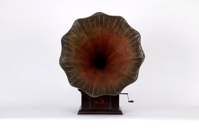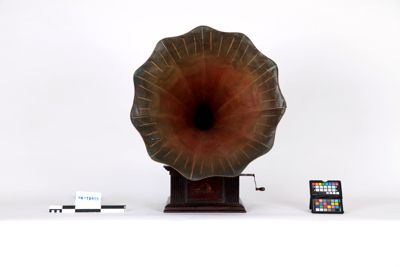 La grande tromba a forma giglio di colore cangiante verde e arancione, con filettature dorate, è sorretta da braccio metallico montato sul pannello posteriore della cassetta.