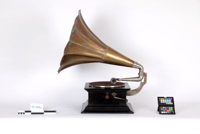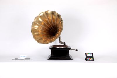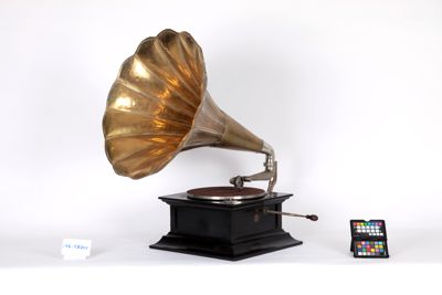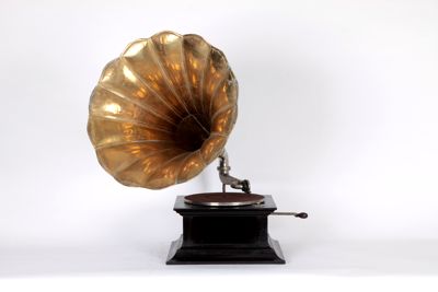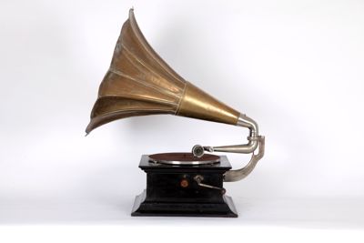 Grammofono con cassetta in legno color scuro e ampia tromba a giglio in ottone.