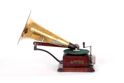 Grammofono montato su una cassa in legno verniciato con base profilata.