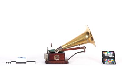 Nella parte posteriore della cassa si trova la manovella per il caricamento del motore a molla, mentre il regolatore di velocità del disco si trova accanto ad esso. Il giradischi, rivestito di tessuto verde, si trova sul pannello superiore.