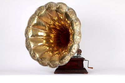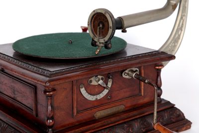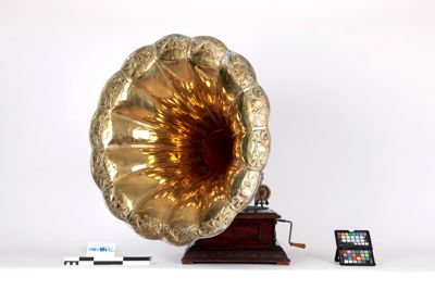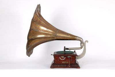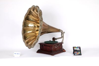 Sul pannello posteriore è montata una staffa di colore argento, che regge la cassa armonica e l'ampia tromba in ottone sbalzato in stile floreale di lavorazione manuale proviente dall'India (Calcutta). Sul pannello superiore si trova il giradischi, ricoperto di feltro verde. Una manovella per il caricamento del motore a molla, una piastra metallica a forma di arco con una scala con numeri da 90 a 100 (giri al minuto), una leva di controllo della velocità, e una targhetta con il marchio del grammofono si trovano sul pannello laterale destro.