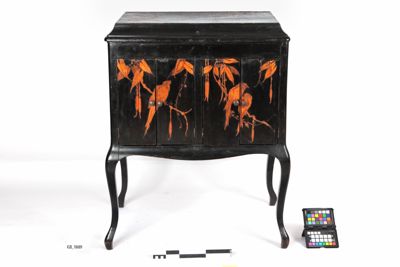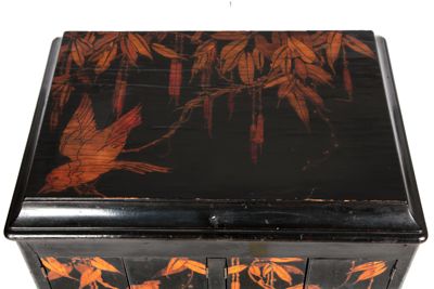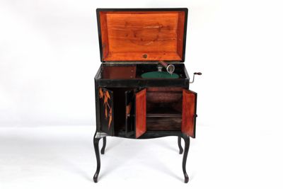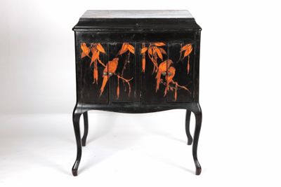 Grammofono a mobile orizzontale con tromba interna, laccato di colore nero con decorazioni a intersio di uccelli esotici.