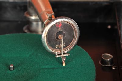 Sul pannello superiore sono montati il giradischi, il braccio che collega la puntina di riproduzione alla tromba interna, e delle leve per l'avviamento del motore e la regolazione della velocità di rotazione del disco. Sul lato destro del mobile è presente la manovella per la carica del motore a molla.