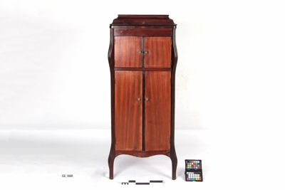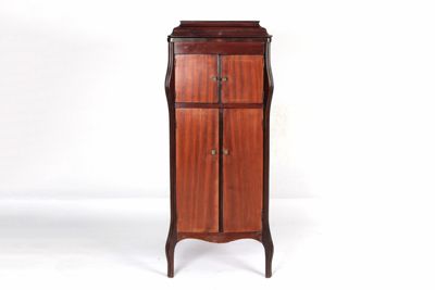 La parte frontale è divisa in due sezioni, chiuse da sportelli. La sezione inferiore presenta quattro scomparti ed è adibita alla custodia dei dischi, mentre quella superiore nasconde la tromba interna.