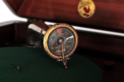 Sul pannello superiore sono montati il giradischi, il braccio che collega la puntina di riproduzione alla tromba interna, e delle leve per l'avviamento del motore e la regolazione della velocità di rotazione del disco. Sul lato destro del mobile è presente la manovella per la carica del motore a molla. All'interno del coperchio è visibile il logo della ditta produttrice.