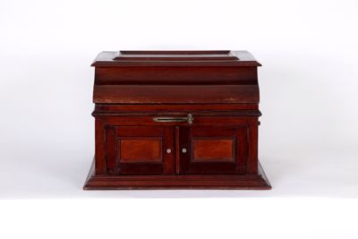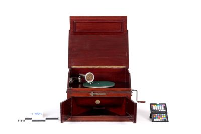Grammofono con tromba incorporata, cassa di legno su piedistallo profilato, con coperchio incernierato, due sportelli e leva di accensione/spegnimento del meccanismo sul lato anteriore.