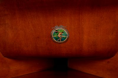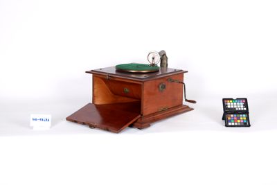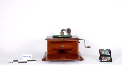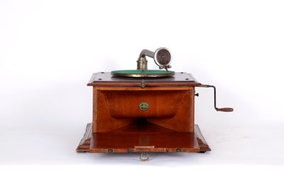 Sul pannello superiore è presente un giradischi rivestito di feltro verde, e il braccio che collega la puntina di riproduzione alla tromba interna. Sul pannello laterale destro si trova la manovella per il caricamento del motore a molla. Sul pannello frontale è presente la leva di avviamento e il marchio di fabbrica.