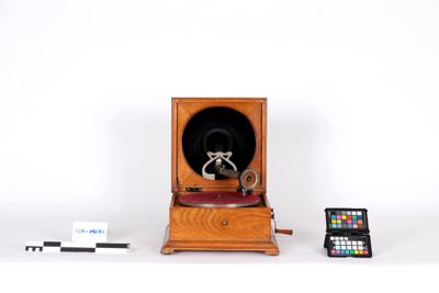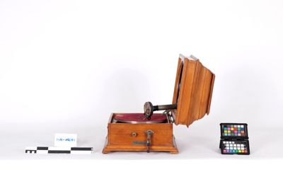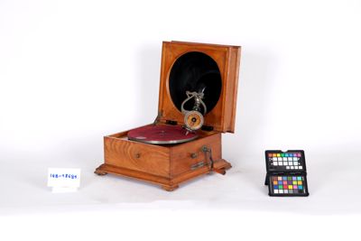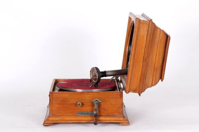 Sul lato destro della cassetta è presente la manovella per il caricamento del motore a molla. Il giradischi, ricoperto da un panno rosso, è montato sul pannello superiore.
