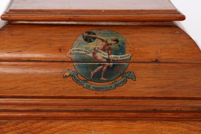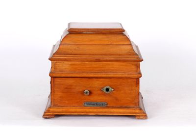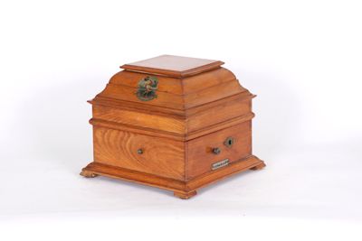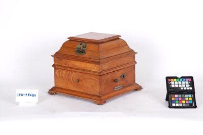 La cassetta in legno di rovere presenta una tromba installata sul coperchio della cassetta stessa, per amplificare il suono emesso.