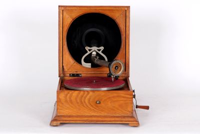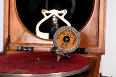 Grammofono con tromba incorporata, modello Réflex Coq, per la riproduzione di dischi Pathé.